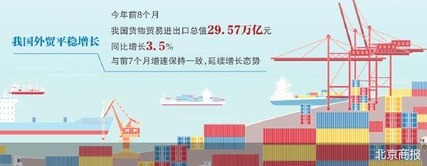 9月8日,海关总署发布的数据显示,前8个月,我国货物贸易延续平稳增长态势,进出口总值29.57万亿元,同比增长3.5%。其中,出口17.61万亿元,同比增长6.9%;进口11.96万亿元,同比下降1.2%,降幅较前7个月收窄0.4个百分点。海关总署统计分析司司长吕大良介绍,今年前8个月,我国进出口累计增速较上半年加快0.6个百分点,其中8月当月出口、进口均增长,已连续3个月实现双增长。面对严峻复杂的外部环境,我国外贸韧性持续彰显、活力不断释放。